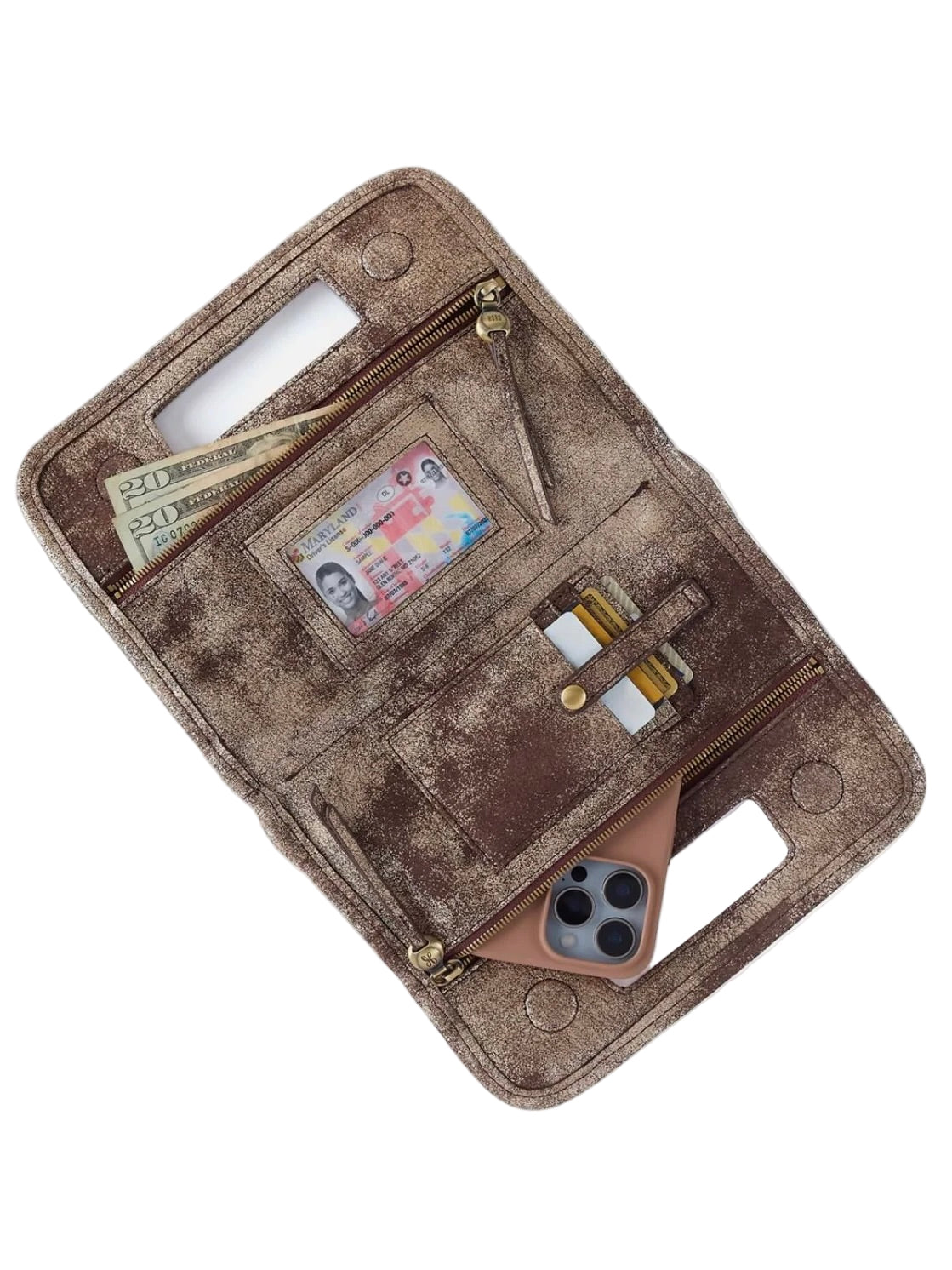 - Interior Front: Zip pocket & 4 credit card slots; Interior Back: Zip pocket & ID window