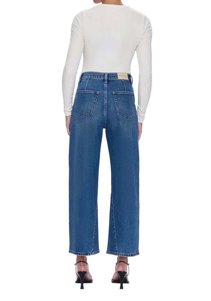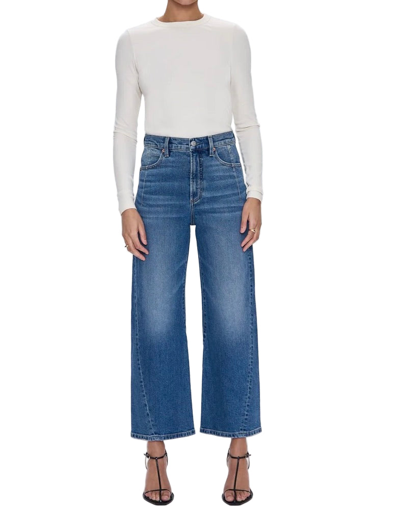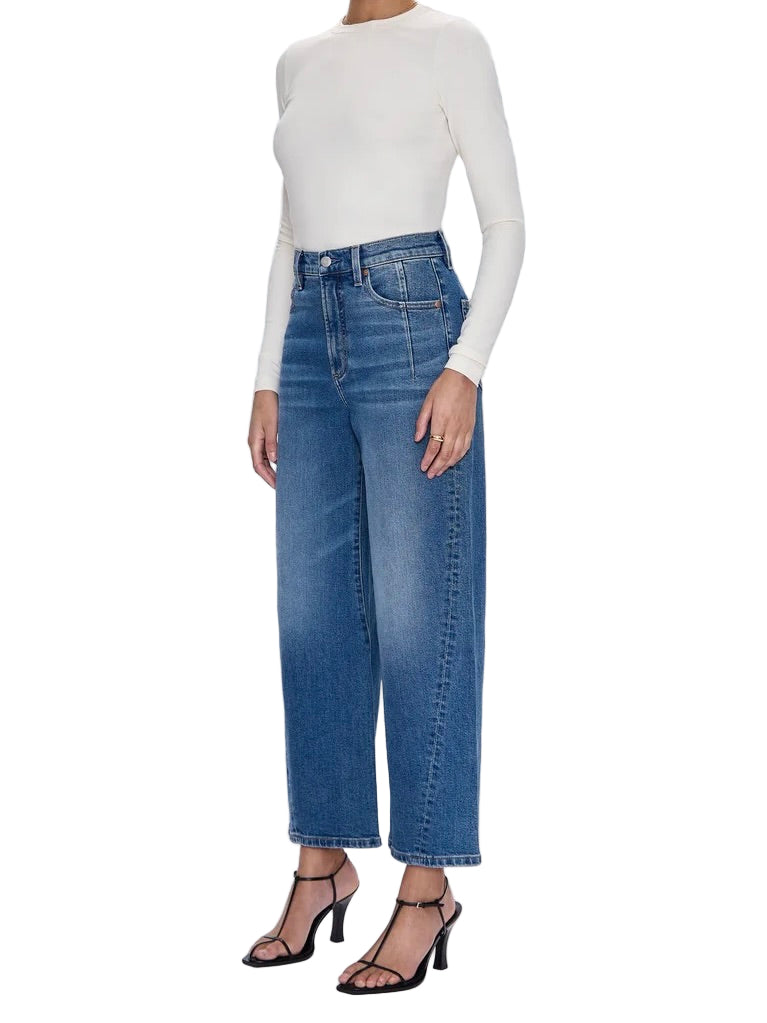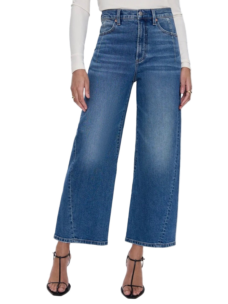 The new must-have jean with a twist. Kyra sits confidently at a high rise with our signature bowed leg silhouette and cropped 28" inseam. The subtle curve creates dimension while the wide ankle opening adds modern proportion with a new wide angle for the season. Fashion detail seaming, including a twisted seam that moves forward and yoke seams in the back, brings modern denim classic sophistication. Crafted from our signature comfort stretch denim in Soho, a medium vintage wash with subtle fading that feels both contemporary and timeless