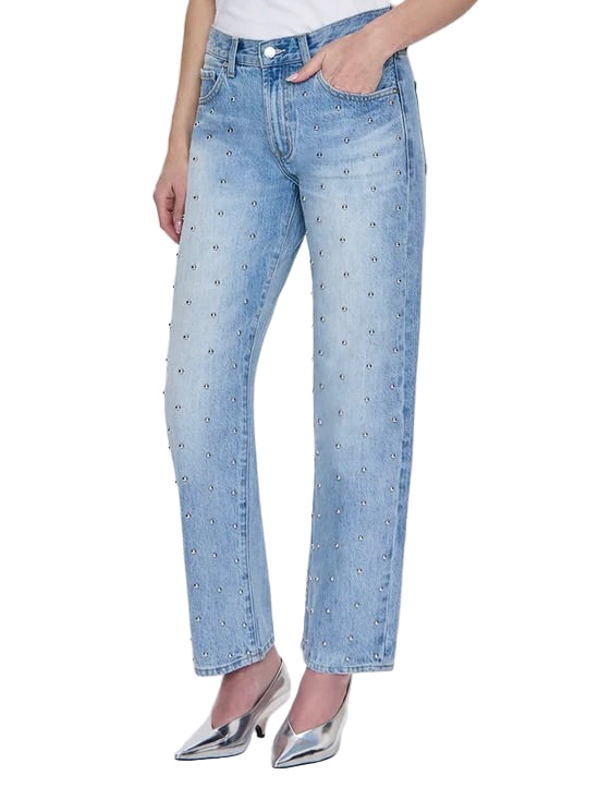 The best-selling jean that understands proportions. Lexi sits at the perfect mid-rise with our signature bowed straight leg, and a subtle curve at the knee that creates dimension without effort. Finished with a 29" inseam, the silhouette tapers to a cropped ankle with a clean hem. Crafted from our rigid denim in Aries, a light blue wash adorned with subtle stud details that feel refined and intentional, never overdone. Your must-have statement jean for making an impact with sophisticated appeal.