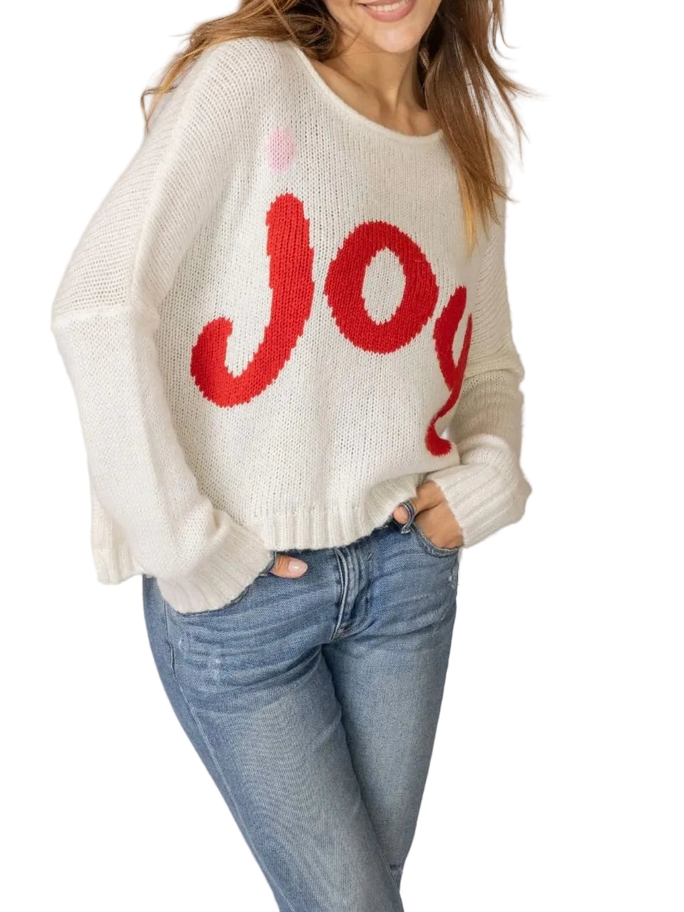 “JOY” knit graphic across the chest